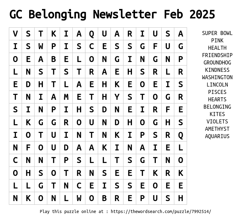 Word Search on GC Belonging Newsletter Feb 2025