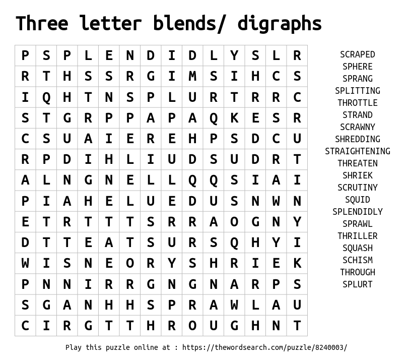 Word Search on Three letter blends/ digraphs